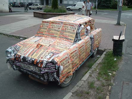 Covered Trabant in Zalaegerszeg. I have long thought about importing a Trabant to USA. I could never make it street-legal, but maybe I could modify it as a golf cart or something.