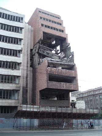 Novi Sad, Serbia eatery. I impulsively decided to spend a few days in Serbia for no reason at all. I hitchhiked down from Budapest, taking the American flag off my backpack for this stretch. I didn't expect everyone to be so forgiving about the Balkan war. The government hasn't forgotten; the buildings below that we bombed during the war stand just as they were when hit.