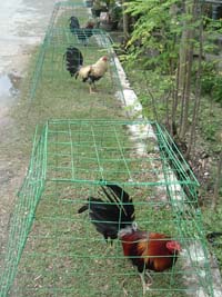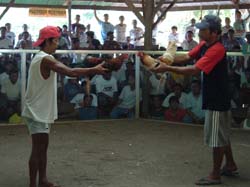 Cockfighting. This is the national pastime of the Philippines, it seems. The birds are in cages or tethered everywhere. (Accordingly, no one gets any sleep in the Philippines.) People were really into it. Some had imported birds from America where supposedly the fiercest fighters are bred. (Who knew?) I went to a couple of fights. Lots of drunk people gambling, and yet no one minded me taking photos.