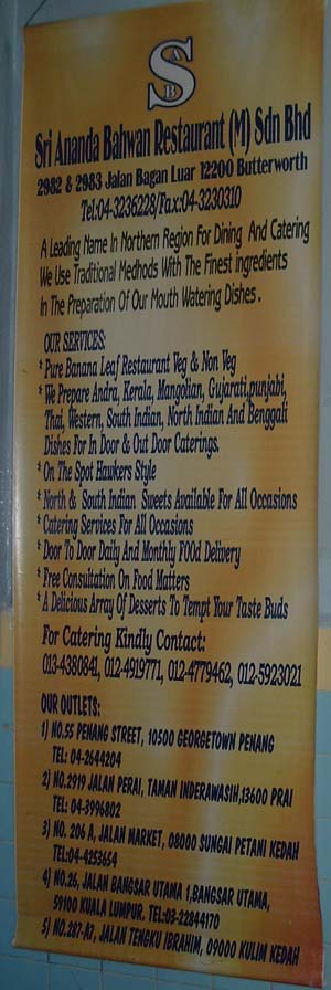 Prices are creeping up, US$2-3 for a large meal, which by backpacker standards is pushing it, but my enthusiasm isn't flagging. My biggest complaint is that I can never buy a Sri Ananda Bahwan staff shirt. I would wear it all the time with pride. Actually, Restoran Sup Hameed (gotta love the name) on the other side of town has a better designed shirt but it's bright pink and I have to stay loyal.