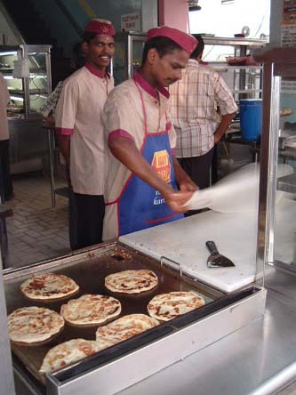 At the entrance to Sri Ananda Bahwan on big outdoor griddles are its superstars, K. Boominathan on roti canai and Murukesh on dosai (also spelled "dosa" and "thosai"). These two are absolute masters of their craft as they show their skills with self-confidence, flair and panache. They always have big bright smiles that belie their hard work. A manager said to me, "Basically, they are from India." I think this is shorthand for "They're enslaved here."