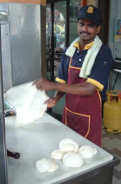 I wish I had sound for Murukesh's dosai video. (I also wish I knew how to have it be less than 6MB--and how can I rotate the roti canai video so you don't need to lay on your side for 45 seconds to watch it? Help, anyone?) The ambient restaurant clatter mixes in nicely with the virtuoso performance. The water that's thrown on the griddle to sizzle, the ordering and barking. It looks like he's hamming it up for the benefit of the camera, but he tosses the dosai to the waiting servers as a matter of course.