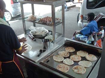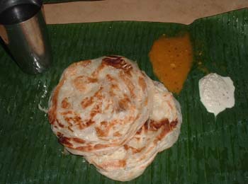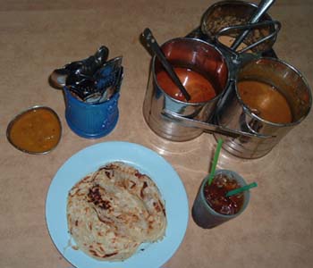 I've seen roti canai most of the time described as an Indian pancake, which is so off the mark that every time I see it I'm enraged enough to hurl my monitor through the nearest window. So what are roti canai and dosai? Actually, dosai is closest to a pancake, a very thin, unsweet one that can have a savory filling or the dosai itself can be dipped into several different sauces. Roti canai is...hmmm, what is it? It's a lightly flaky, slightly doughy concoction...uh, um, "roti" does mean bread in Malay...heck, I can't explain it. Let's just move on...