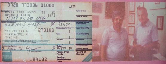 This kills me. It is a credit card receipt from former Vice-President Spiro Agnew for a travel agency on Patpong Street posted in the window!
