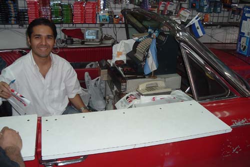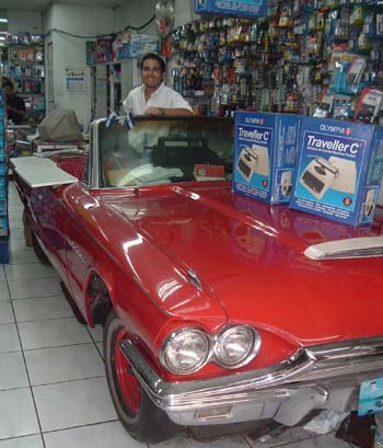 Now this was very cool. In downtown San Salvador there is this electronics shop that had an old car parked right in the middle that acted as furniture. The cash register is on the dash (see photo below).