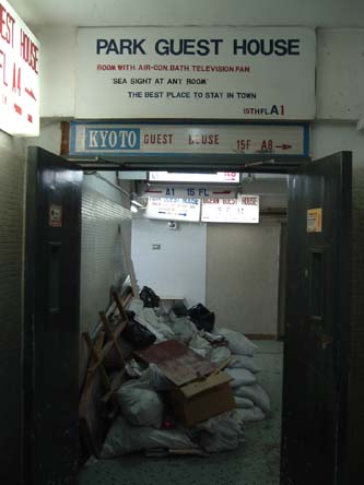 ![]() The famous Chungking Mansions in Hong Kong. This is the scariest building in the world. I never feel so close to death than when I am on even just the 3rd floor of this fire hazard. Few elevators, stairways going only a few floors before disappearing, filthy ventilation shafts, water dripping everywhere, dank, dark, decrepit, etc. Everytime I visit (it's THE place to change money and eat Indian food and I like to marvel that such a place exists in downtown Kowloon) I remember the Swedish guy who was staying at a guesthouse on the 11th floor when a fire broke out. He tried to escape by tying bedsheets together and rappelling down the side of the hotel, but they came apart and he died. He was the only one to die, as I recall, but no matter, I'd probably be doing the same thing. I can never bring myself to sleep here, and I have very low standards. You have to love their chutzpah: The best place to stay in town! |