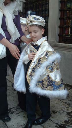This boy is dressed like this because he is about to be circumcised. I think I would need more than a frilly cape to get through it.