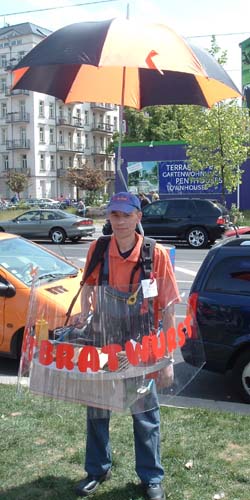 Standing grill bratwurst vendor in Berlin. This has to be a much tougher job than it looks.