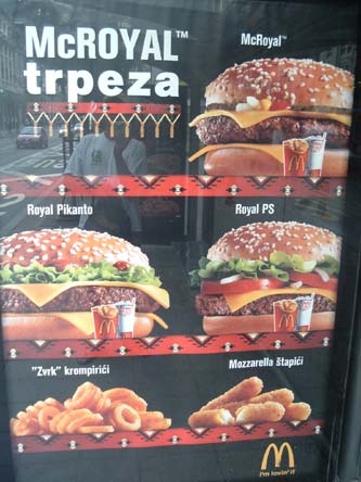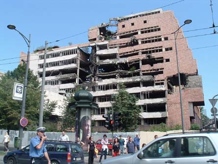 Novi Sad, Serbia eatery. I impulsively decided to spend a few days in Serbia for no reason at all. I hitchhiked down from Budapest, taking the American flag off my backpack for this stretch. I didn't expect everyone to be so forgiving about the Balkan war. The government hasn't forgotten; the buildings below that we bombed during the war stand just as they were when hit.