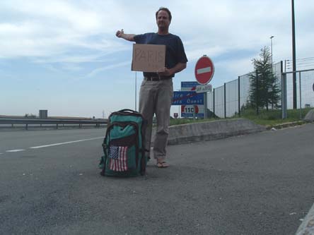 Hitching to Paris from Belgium. Notice the technique: hiding the flip flops behind the bag, back straight, alluring smile and general fantastic form. I really should write a book.