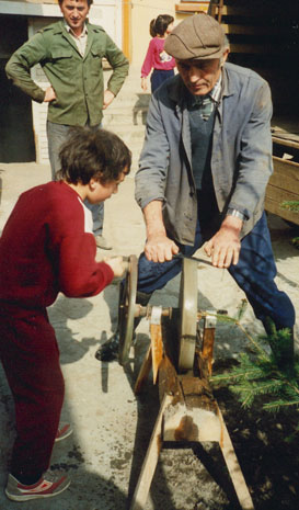 The father of the house runs the show, but everyone goes about their business and not much conversation is needed. The sharpening of the knives was done with the grandchild cranking the wheel.
