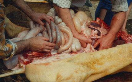 When the pig is sliced open, the guts burst out and care is taken that they don't fall to the ground.
