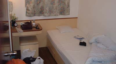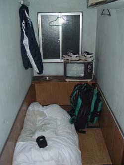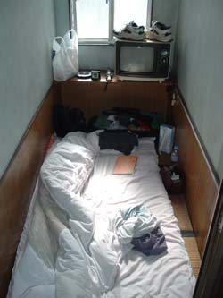 ATTENTION!! There are newer, cheaper, much more depressing places to stay in the the neighborhood! I stayed at this place about 200 meters away from Escargot. It was about 1500 yen, but an even tinier room and the room was just bigger than the bedding. I am standing outside the room to take these two photos