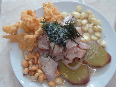 These next three photos are my homage to Peru's great contribution to world cuisine, ceviche. Ceviche is done in other countries but it's not the same. It is raw fish, usually mackerel or a combination of seafood with a piece of yam, roasted corn, deep fried chicharron (which isn't pork skin!) and I forget what the seaweed stuff is called. I ate it every chance I had. These two lunches (and it's only for lunch) pictured here cost about US$2.