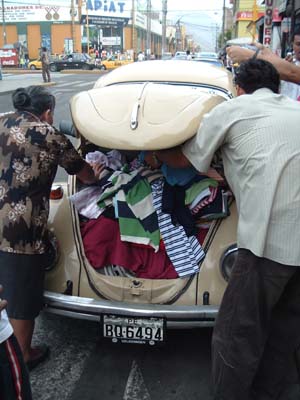 A guy selling clothes out of his car in Trujillo and another guy relaxing